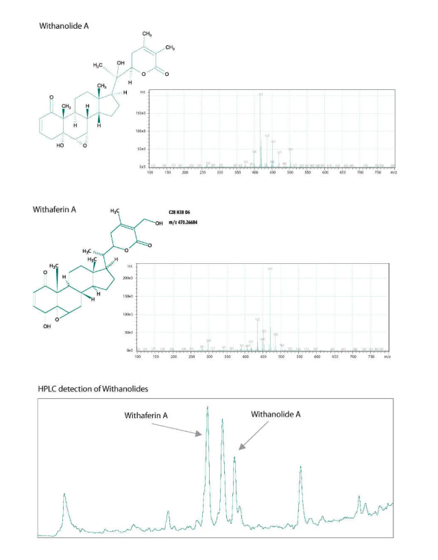 Ashwagandha (Withania somnifera) is an Indian (Ayurvedic) herb which contains a group of clinically important steroidal compounds referred to collectively as withanolides. Ashwagandha contains more than fifty withanolides which vary greatly depending upon the geographic location and plant part. The withanolide profile and content is a key determinant of Ashwagandha quality and efficacy. Liquid Chromatography/ Mass Spectrometry (LC/MS) is the method of choice for characterizing such a wide range of similar compounds and unequivocably identifying key major components such as withaferin A and withanolide A. This technique is used routinely in the MediHerb Quality Control Laboratories to identify and analyze Ashwagandha and other saponin-containing herbs.